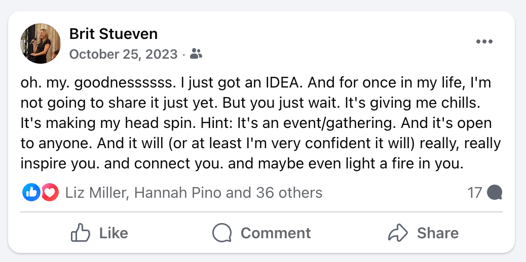 I wrote that long before this event existed or even had a name. Before I could picture what it might look like or who would come. And now, before I have proof that I can do this version of hosting for this kind of event in this big of a room…